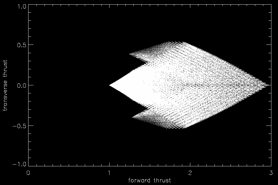 Taken together, the zero-torque condition and the deflection and thrust constraints of individual engines limit the attainable (vector sum) thrust in longitudinal and transverse directions. These engine configurations are mapped in the diagram below. It is assumed that at least one of the engines is at maximum thrust. If the destroyer's maximum straight-line acceleration is 3.0 units, then its maximum sideways acceleration is about 0.55. This transverse acceleration is only achievable while there is a forward acceleration of about 1.7.