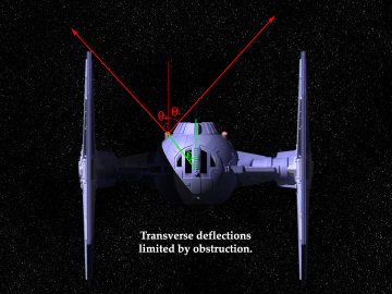 Schematic representation of the limits on thruster deflection, with the example of a TIE fighter (viewed from above). The θ angular limits on thruster deflection (marked in red) are due to obstructions on the ship. The angle between the main axis (blue), the centre of mass and the engine position is denoted by ε (in green).