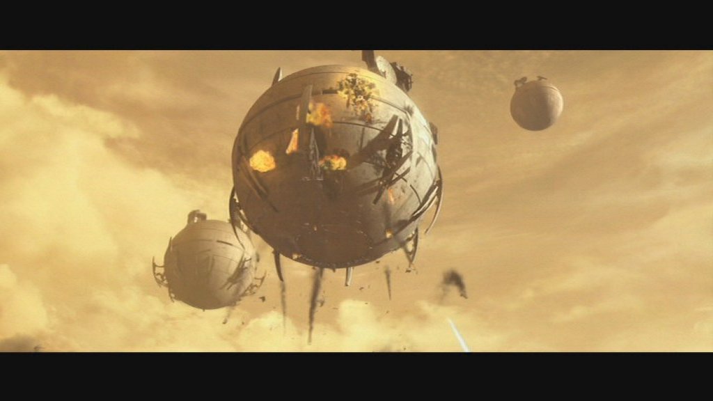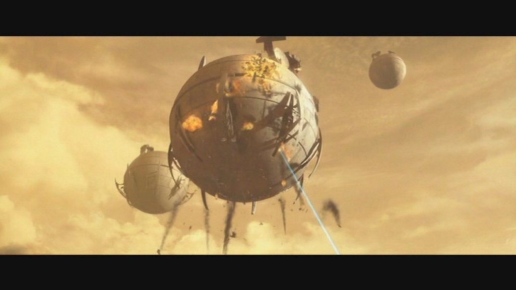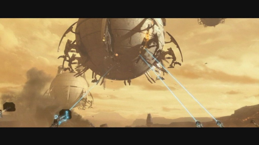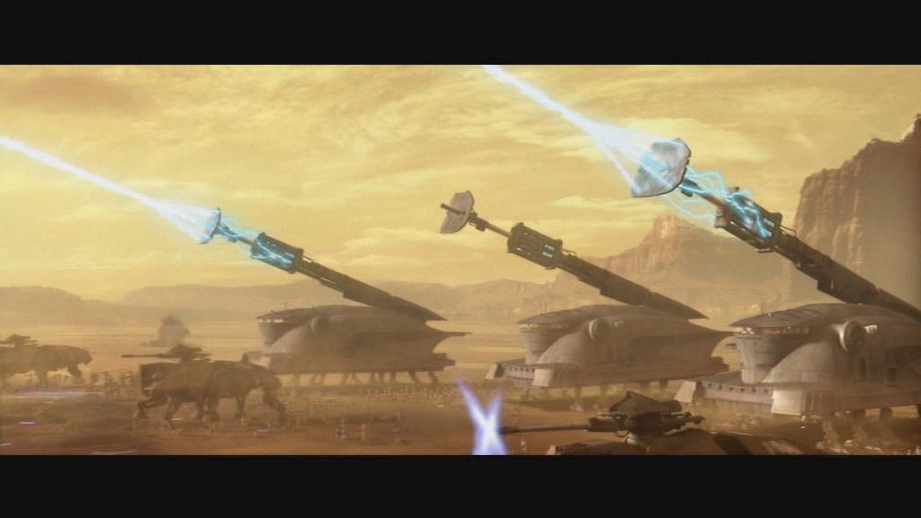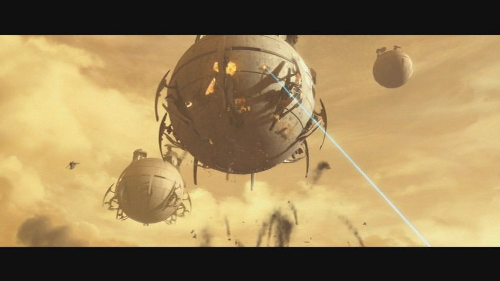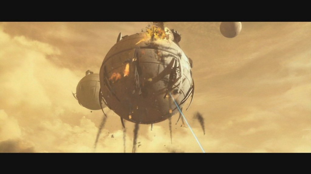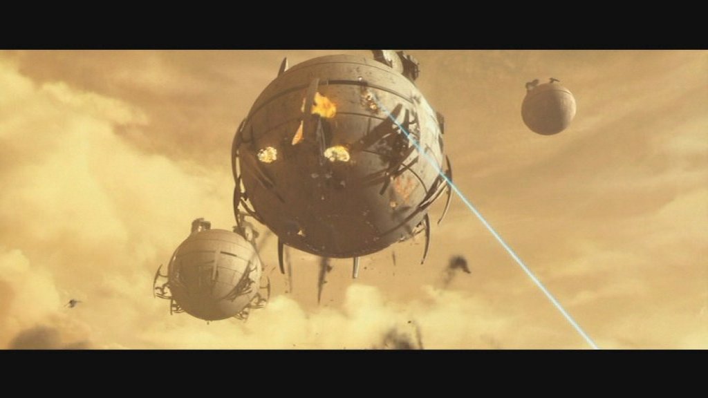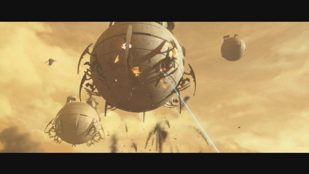 Beams from a group of SPHA-T guns penetrate the shields of a launching core ship and slice into its hull. [PAL DVD widescreen version of AOTC]
