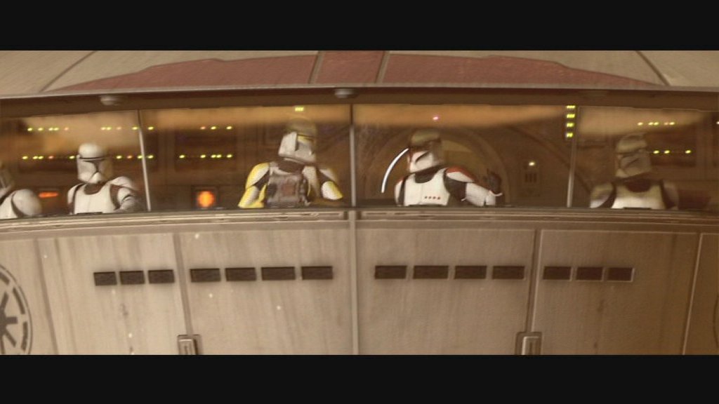 Closeup of clone crewmen in the upper deck control room of a SPHA-T, behind the window. [PAL DVD widescreen version of AOTC]