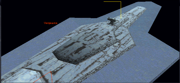 The command tower is the standard KDY shape (seemingly unlike that of the coincidentally-named Vengeance from Dark Forces II), but it may have been shrunk in order to conform with the incorrect ship length. Interestingly though, the linear array structure usually placed between the scanner globes is absent. [J.Helper]