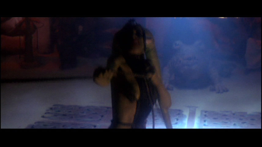 Bubo lurks in the light behind the Twi'Lek dancer Oola as she protests against the beastial affections of Jabba the Hutt.