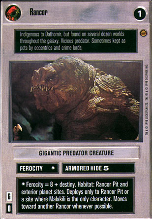 Rancors are huge, voracious, long-armed predators which roam the forests of the remote and little-known planet Dathomir. They are also found on dozens of other worlds. The leathery brown hide is thick enough to allow a rancor to shrug off hits from hand-held blasters. Their maws are full of sharp, triangular teeth which are primarily used for gripping and rending prey; a rancor does very little chewing, preferring to swallow food in large chunks. The specimen owned by Jabba the Hutt was a juvenile in poor health, standing at only five metres tall. Wild rancors grow to greater dimensions.