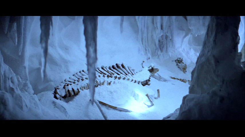 Skeleton of a tauntaun lies in the lair of a wampa. The absence of visible ribs may indicate something about wampa eating habits. It is possible that the ribs were torn off and either eaten with the flesh or else discarded to a different location.