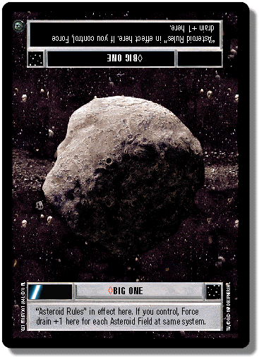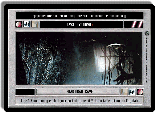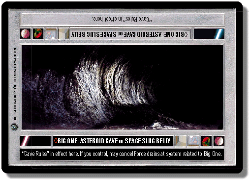 When this site is a belly, starfighters may not land or take off if the Space Slug's mouth is 'closed' (as defined by the Space Slug's game text). If the Space Slug is lost, all cards in the belly are also lost and the site then slides next to the Big One, reverting to a cave. Whether the site is a cave or a belly, it is always 'related' to the Big One, and characters, vehicles and creatures may deploy there normally.