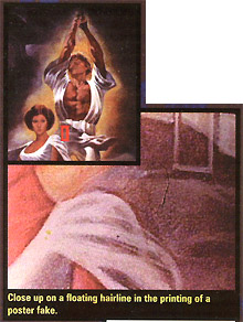 This will be important information for you to consider when inspecting posters for purchase. There is apparently no difference in price between these various printings. Bootlegs of this poster are known to exist. Besides the typical telltale signs of bootlegging (27"x40" rather than 27"x41"), there's on incredibly good fake that has only one identifiable flaw in it - a hair in Luke's belt. Here's a scan of the hair error from the Star Wars Galaxy Collector #5 (Feb. 1999)