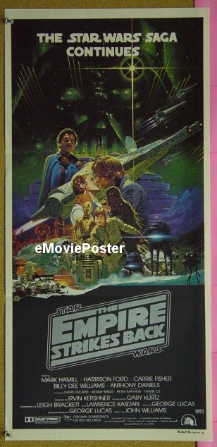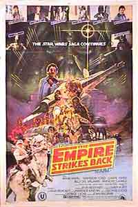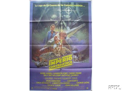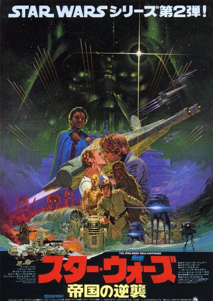 Utilizing artwork from Japan by Noriyoshi Ohrai, this poster features some of the best Star Wars art ever produced. It is from US Spanish-speaking cities and Mexico. With a take on the kissing scene poster, it also is the only poster to feature IG-88, 2-1B, and Hoth Rebel troops in battle. It features a nice rendition of Lando, too.
