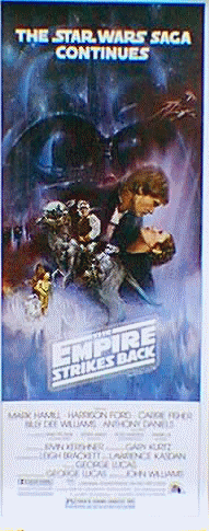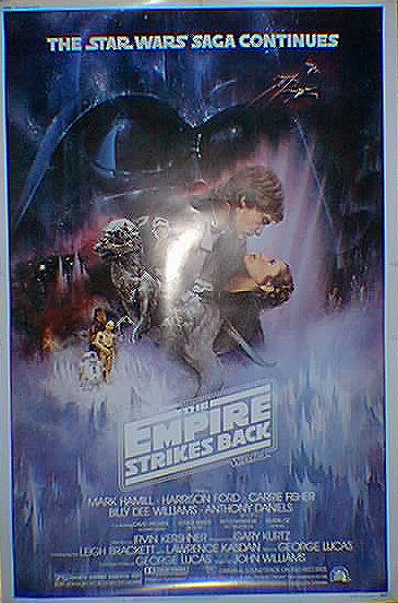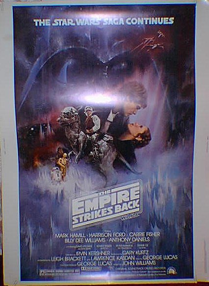 This is the much sought after style A. It hit theaters in May 1980. It was painted by Roger Kastel and inspired by Tom Jung's 1967 re-release poster for Gone With The Wind. This design was quickly replaced by the much more common style B shortly after it was released. The story goes that Billy Dee Williams was unhappy because Lando was not in the art. In response the studio pulled this style from circulation. Later products which featured this art incorporate Lando into the artwork. This poster is also know as the Gone With The Wind style for obvious reasons. There are reprints and/or bootlegs known to exist so beware. There are at least 2 different print runs known for this style. The one (shown above) is the NSS (National Screen Service) version. This has the disclaimer on it saying it is the property of the National Screen Service. Most of these are folded as most posters being sent to theaters in 1980 were stilll being sent that way.