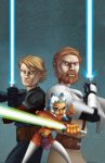 The Fillbach Brothers have worked on the previous Clone Wars Adventures series based on the micro-series, and their style was appropriate for that adaptation. But compared to the more realistic 3D "puppet" style of the new cartoon series, their artwork seems blocky and childish. They do create a lot of details, but the simple style might throw off some fans of the new cartoon expecting the same look. For me, it's fun to look at all the background details and expressions of the characters that communicate a lot of what they are thinking. The cover by Scott Hepburn is a bit weird, where Ahsoka seems like a tiny pixie in front of the other two Jedi. As an incentive for purchasing The Clone Wars on DVD and Blu Ray on Nov. 11th, Target offered the comic with an exclusive variant cover, and I prefer that one way better.