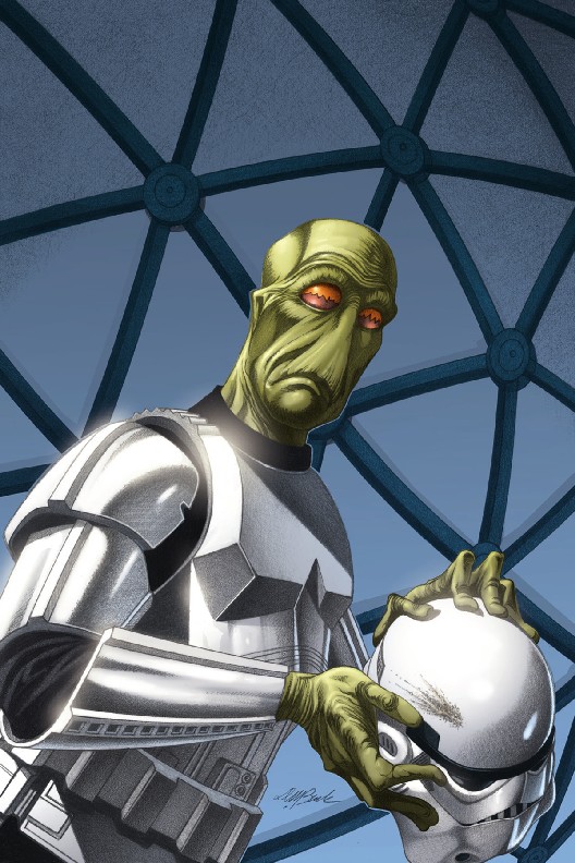 Cade Skywalker has taken a backseat in this story, which follows two separate storylines that will undoubtedly converge on the Wheel space station. First off, we find out what happened to poor Bothan Jedi Hosk Trey'lis after Cade and friends captured him back in issue #2. He is being held prisoner in the Sith Temple on Coruscant and being interrogated by Darth Maladi, the head of Sith Intelligence (formerly known as Imperial Intelligence). The Sith lady finally breaks the serene Jedi, and in a very touching scene learns about Skywalker's associates (Jariah Syn and Deliah Blue), on which planet they captured him (Brogar's safehouse on Socorro) and to whom they sold him (Rav the pirate). That information is also relayed to Moff Calixte who is put in charge of capturing Skywalker alive by Darth Maladi. But information like that can be dangerous when placed in the hands of such an ambitious Moff, especially when she is the lover of the one who desires to be Emperor, Grand Admiral Morlish Veed. They both plan to get to Skywalker first before the Sith kill him or turn him to the Dark Side. By monitoring the security cameras there, Calixte has learned that Skywalker was last seen on the Wheel in the Besh Gorgo system.While the Sith have their own agent Jor Tolin on the case, they are not aware of a former Imperial spy named Morrigan Corde and that's why Calixte wants to hire her to capture Skywalker.