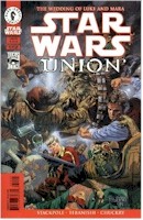 Speaking of which, the group led by the Moff Derran Tekkar have more of a role in this issue. They start by finding a headquarters for their operation, then start surveillance on Mara while she drives around Coruscant with a light escort. There is a scene at a museum where Tekkar expresses his concern that the New Republic does not show the Empire as it was, but rather as exagerated propaganda. How little does he know... Then two of the Imperials start a stakeout of the wedding location, disguised as vermin exterminators. And finally, three of them, including the "main guy" from last issue Banner Sumptor, are sent to the Red Rancor to kill the groom. But when the bar brawl starts, Sumptor decides to secretly stop a Trandoshan from bashing Luke with a table. He later explains that if they are to strike, it has to be known that it is Imperials who killed Skywalker not a bunch of swoop low-lifes.