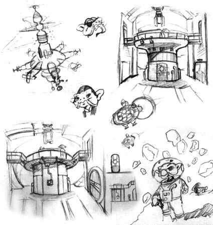 The first sketch of Nyabn Station; interior of the Chubby Gundark's cargo bay; Nien Nunb; cargo pod tugs; Bungo in space.
