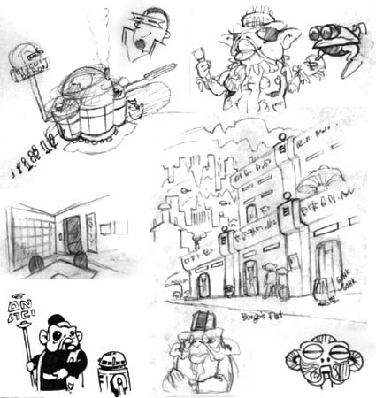 A Biscuit Baron franchise with Baron Tagge's likeness; a Sullustan reporter; interior & exterior of Bungo's flat; a SoroSuub picketer; Sullustan holy man; an ancient relic.