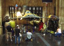 The ship begins to levitate out of the hangar. BATTLE DROIDS fire at it as it falls in behind five other fighters. ARTOO whistles to ANAKIN from a second fighter not far away.