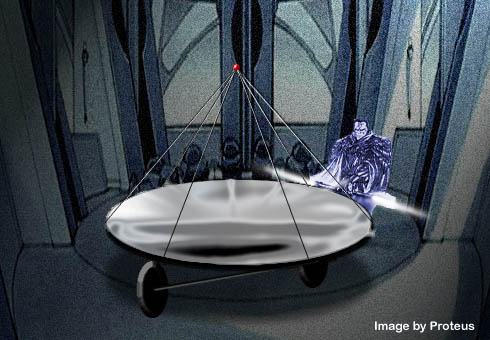 Proteus: 4/14/98 - There is a rumored scene where Darth Maul talks to Darth Sidious via a holo-transmission. The dish in the middle of the room is the holo-projector, and Darth Maul is represented by an Exar Kun sketch from Tales of the Jedi. Proteus made a representation of the scene, and says that this picture is based on more than just speculation, but we can't confirm or deny that just yet. Hopefully we'll have more details later. Click here to see it.