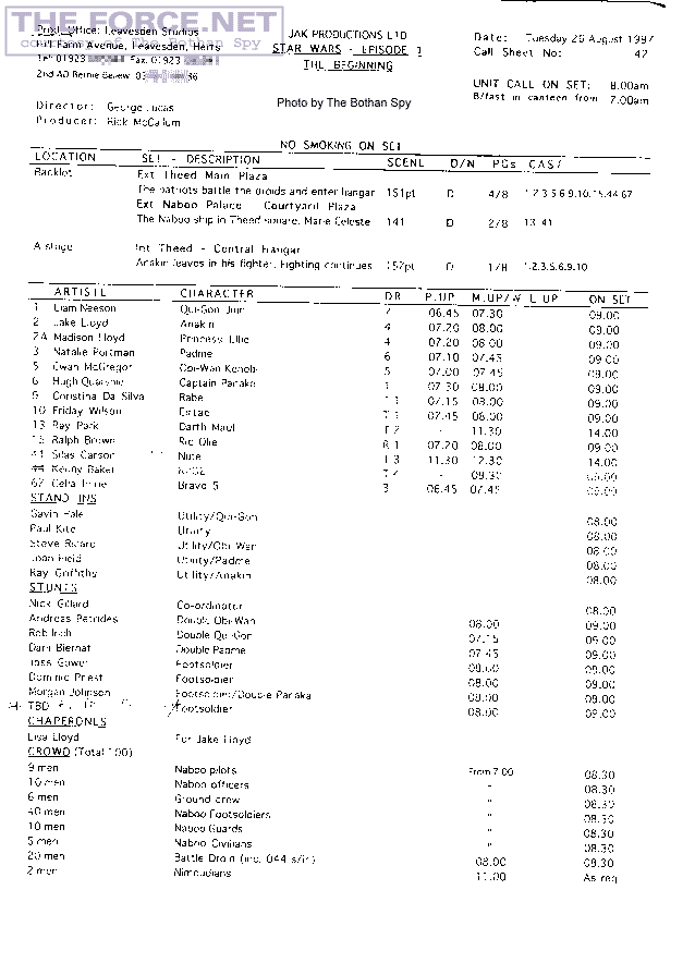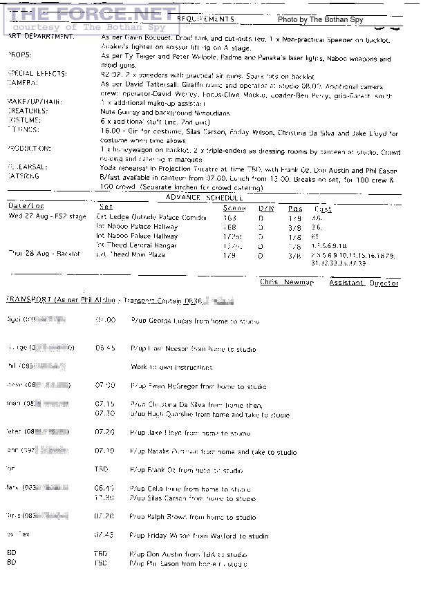 "The Art Department was in overdrive while I was there....and this was a Saturday! They have been told by Lucas that the shooting schedule has been moved up 3 weeks and that didnt give them much time to complete drafts for the final sets being used in the films. I was told that out of the 50 or so sets that are being built in England, only about 75% of them have been finished and the Art Department is working overtime to get the rest of the plans for the sets finalized by the new shooting date......."