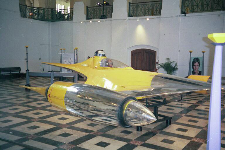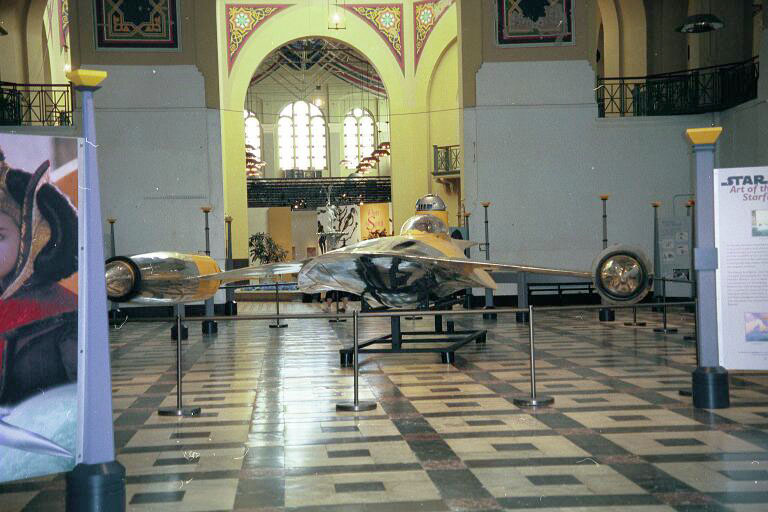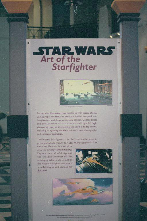"Star Wars: Art of the Starfighter" is an exciting exhibit that brings to life the models used in the creative process of making films. When you walk through the doors of the Arts and Industries Building you come face to face with a full size 35 foot Naboo Starfighter used in the making of Episode I: The Phantom Menace. It is approximately 35' x 22' in size and the entire exhibit is 3000 square feet. There are 2 interactive kiosks. The first features a documentary video from Lucasfilm and the second contains 2 interactive games, Pit Droids and PlayStation 2 "Star Wars Starfighter".