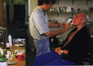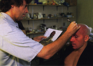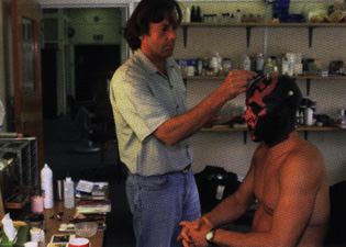 Darth Maul: "Ray has a fair coloring. The red I used was actually a water-base aquacolor that would fade but it was quite easy to reapply by sponging on. The black was Reel tattoo color, which I had to paint on. It's kind of elasticized so would tend to peel rater than run. I sponged it on with a fairly heavily saturated alcohol-based sponge and a lot of black pigment. The Reel Creations tattoo colors worked very well, I should say, even in the heat of the Tunisian desert. Even with all of the action scenes shot out there, it worked."