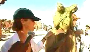 In this 2 minute and 25 second On Location clip, Ahmed interviews Trish Bretland who helps the alien extras keep cool in the desert heat.