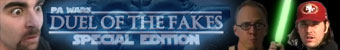 Originally Released: 2002 Story:Duel of the Fakes takes place about two minutes after the cliffhanger ending of "P.O.'d PA" in the saga of PA Wars. Will Sponikan Sponewalker win his freedom back and realize his dream of being a Jedi Knight? Will Qui-Stay-Gon be lured back to the Dark Side? Will Executive Palpitadd's powers of evil be strong enough to destroy the PA? What will become of poor mutilated Yoda? All of these answers and more await you in the hilarious and thrilling new installment of PA Wars.