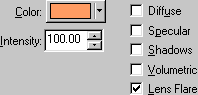 2) On the Attributes tab of the Properties Panel, turn off Diffuse, Specular, and Shadows and turn on Lens Flare. Change the color to Red: 255 Green: 155 Blue: 102.