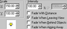 3) Go to the Flare Global tab on the Properties panel. Turn off "Fade When Behind Objects" and "Fade When Aiming Away." Change the X Scale field to 150.