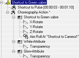 1) Create a New Choreography by right clicking (Command Click on the Mac) on the Choreographies folder and selecting New Choreography. Click on the Choreography in the Project Workspace and type 40 into the Length field. Drag the Lightsabre model onto the choreography, then add an "Aim Roll At" constraint by right clicking (Command Click on the Mac) and selecting New Constraint>Aim Roll At. Select the Camera as the target. This will make sure that the sabre always faces the camera. On the General tab of the Properties Panel uncheck "Cast Shadow" and "Receive Shadows." On the Rotate tab of the Properties Panel of the sabre model, enter -100 into the Y rotate field and 0 into the X and Z fields.