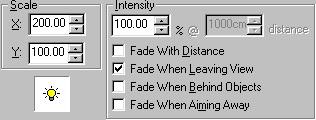2) Click on the Flare Global tab on the Properties Panel. Uncheck "Fade When Behind Objects" and "Fade When Aiming Away." Enter 200 in the X Scale Field.