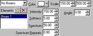 10) Click on the Flare Beams1 tab on the Properties Panel. Select Beam 1. Change the color to white. Change the Intensity to 150, Softness to 5, Spectrum to 50, and the Spectrum Repeats to .8. Set the X scale field (the on on the left) to 150 and Y scale field (the one on the right) to 500.