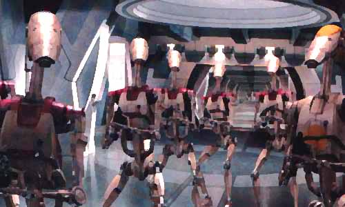 lightsaber. One of the droids contacts his superiors with his comlink.