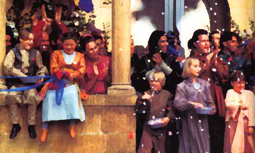 You see a lot of people cheering and having fun! A lot of kids are singing and clapping their hands and they are all looking in the direction of the Palace.