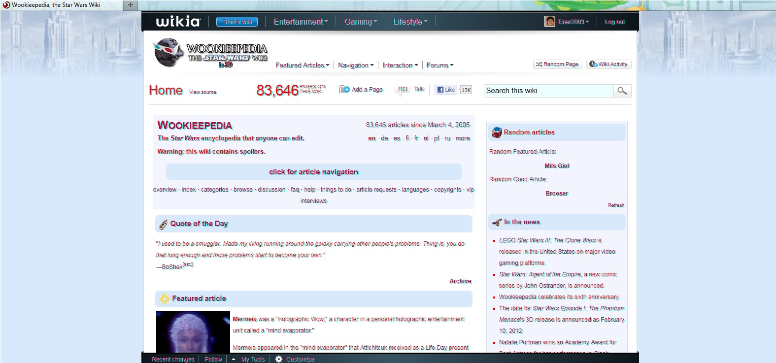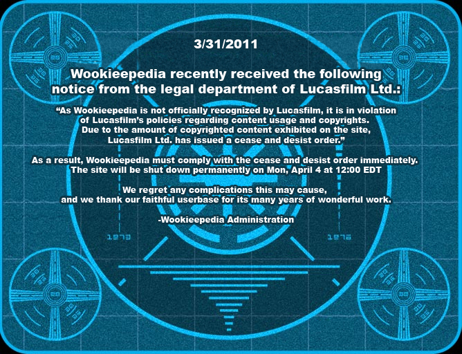 Wookieepedia "went 3D" for the day. All pages were rendered in red-blue text, and bothlogos sported 3D branding. A large image on the Wookieepedia homepage also claimed that the site had received a cease-and-desist letter from Lucasfilm for violations of the company's "policies regarding content usage and copyrights." It warned that a permanent shutdown would take place at 12:00pm ET on April 4th.