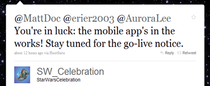 This is why it pays to follow Reed's Celebration V Twitter feed. On Thursday, a friend of mine suggested that a CV mobile app would be a good idea. I supported the suggestion, as did another friend. After all, it would be great to have panel start times, autograph prices, vendor exclusives, and everything else CV-related contained in one little app on your smartphone. Think of all the printouts you could leave in your room each day!