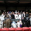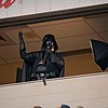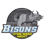 Once again, 30+ members of the North Ridge, Buffalo's Fan Force chapter, with an assist from Echo Base and the Canadian Base of the Rebel Legion and Garrisons Excelsior and Carrida of the 501st, strove to provide a game of STAR WARS entertainment. In addition to character photo stations, Bison's mascot Chip in carbonite (the prop from last year's adventure) made an appearance. Laser swords and T-shirts with the special STAR WARS Bisons' logo sold briskly. Many STAR WARS characters participated in game day promotions like the fist pump, base races, 7th inning stretch Kiss Cam (Vader smooching mascot Belle the Ballpark Diva) and of course Vader singing ?Take Me Out to the Ball Game,? in tune this year.