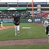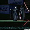 The real excitement began at the end of the 5th inning, as the 1st of 6 filmed chapters played on the HD Jumbotron, setting up the epic battle on field after the end of the game. Each episode wove a concise plot thread ? The Emperor's scheming, the Jedi training, then searching the stadium for Sith, the mysterious Jedi Galen Marek, who might be a Sith double agent, all leading to a climactic confrontation. Each filmed segment was met with wild applause, the anticipation building till the 9th inning. After the game, the segments were repeated, then the lights went down, and the combatants moved into positions across the diamond.