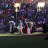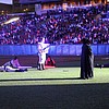 After a few dedications to departed members of the Star Wars and North Ridge families, a brief recap video played onscreen, and then the battles began. Overseen by the Emperor and his entourage of Vader, Grevious, and Mara Jade, the Sith forces sparred against each other in pairs. Then Palpatine commanded Darth Maul and Savage Opress to test the other Sith. This was interrupted by the arrival of Luke and Galen, who led the Jedi forces onto the field to engage the Sith. Midway through, the Emperor stopped the battle with a field-wide Force push, after which Galen revealed himself to be Sith and fought Luke while the Jedi and Sith combatants regained consciousness. Luke defeated Galen - the crowd going absolutely wild at this solo duel ? but they were hushed into silence as the Emperor revealed he had captured the mascots and many other Jedi. There were audible gasps from the audience as Luke, in order to save the mascots and prisoners surrendered, followed by stunned silence as the Sith slaughtered their dueling combatants on the field, leaving the mascots and Jedi prisoners alone on the field amid the bodies. A final video transmission then played, revealing a ship full of Jedi forces making their way quickly to the rescue, setting up next year's finale.