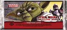 Star Wars: The Clone Wars Widevision trading cards present season one of the hit Cartoon Network TV show the way it is supposed to be seen – in stunning widescreen! Each extra-wide card showcases the incredible CGI (Computer Generated Imagery) of the animated series with key scenes from every episode. In addition, each card back contains trivia, quotes, guides and in-depth, insider info.