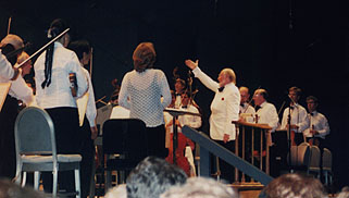 First on the program was "Sunrise" from Also Sprach Zarathustra by R. Strauss. You may know it better as the theme from 2001: A Space Odyssey. Williams pointed to the base section and a low thrumming came from the instruments. Cooool! As the piece progressed, Williams arms moved gracefully conducting the musicians. You could not take your eyes off him. Rarely have I seen someone so passionate about their performance, but you could see it with Williams. His eyes would close and he would be pointing to the various instruments as their parts came up. Right away you could notice Williams mannerisms. When a quiet piece would come up, he would put his finger to his lips in a Shush! gesture. If it was a very quiet piece, he would lower down as if he were tip-toeing through a room. When a big resounding part came up, he would literally wind up like a pitcher and you could see and hear him taking in a big breath just as it took off. He often did it with his eyes closed.