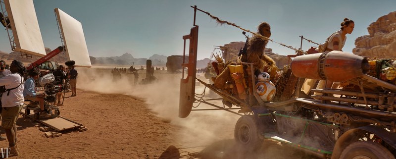 They don’t do it that way because it’s easy. Abrams and his crew had to build miles of road into the desert. They basically had to set up a small town out there, populated by the cast and extras and crew—the creature-effects department alone had 70 people. The Jordanian military got involved. The Jordanian royal family got involved. There was sand. There were sandstorms, when all you could do was take cover and huddle in your tent and—if you’re John Boyega, who plays the ex-Stormtrooper Finn—listen to reggae.