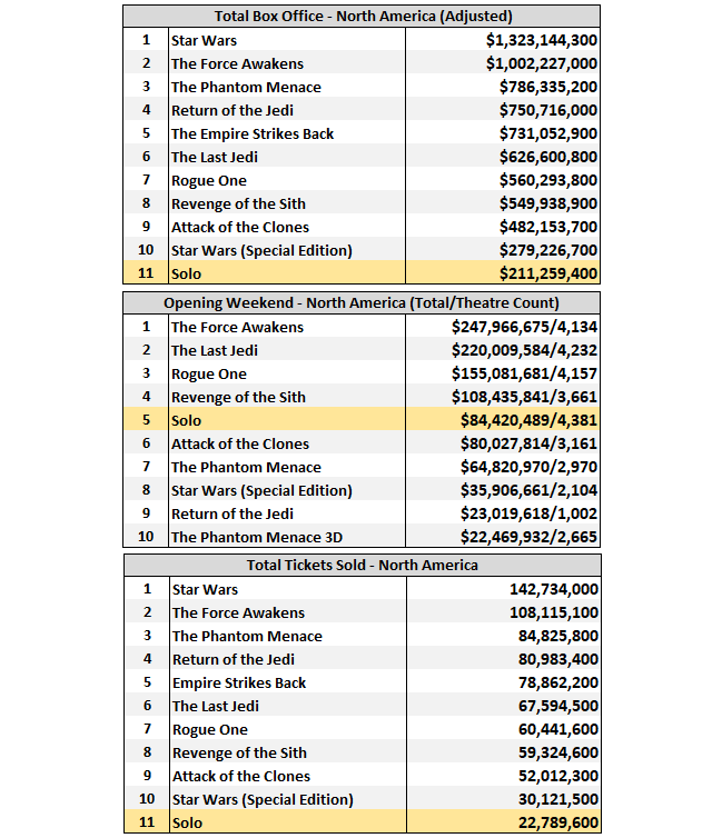 The numbers worth focusing on are theater counts and number of tickets sold. That's where the numbers are disproportionate and clearly show the success or failure of a film and it's here Solo really fails in comparison to previous entries. Obviously as years have gone on, theater counts have increased (thanks to Star Wars) and inflation has increased along with it making the price of admission an all time high. The average ticket price for 2018 so far is $9.27, compared to 1977 when the first Star Wars was released, when it was $2.23. This is why it's important to look at adjusted numbers and more importantly, number of tickets sold.