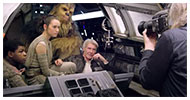 -J. J. Abrams directs Actress Daisy Ridley for a scene in which her character, the young heroine Rey, pilots her speeder through a bustling marketplace on the planet Jakku.