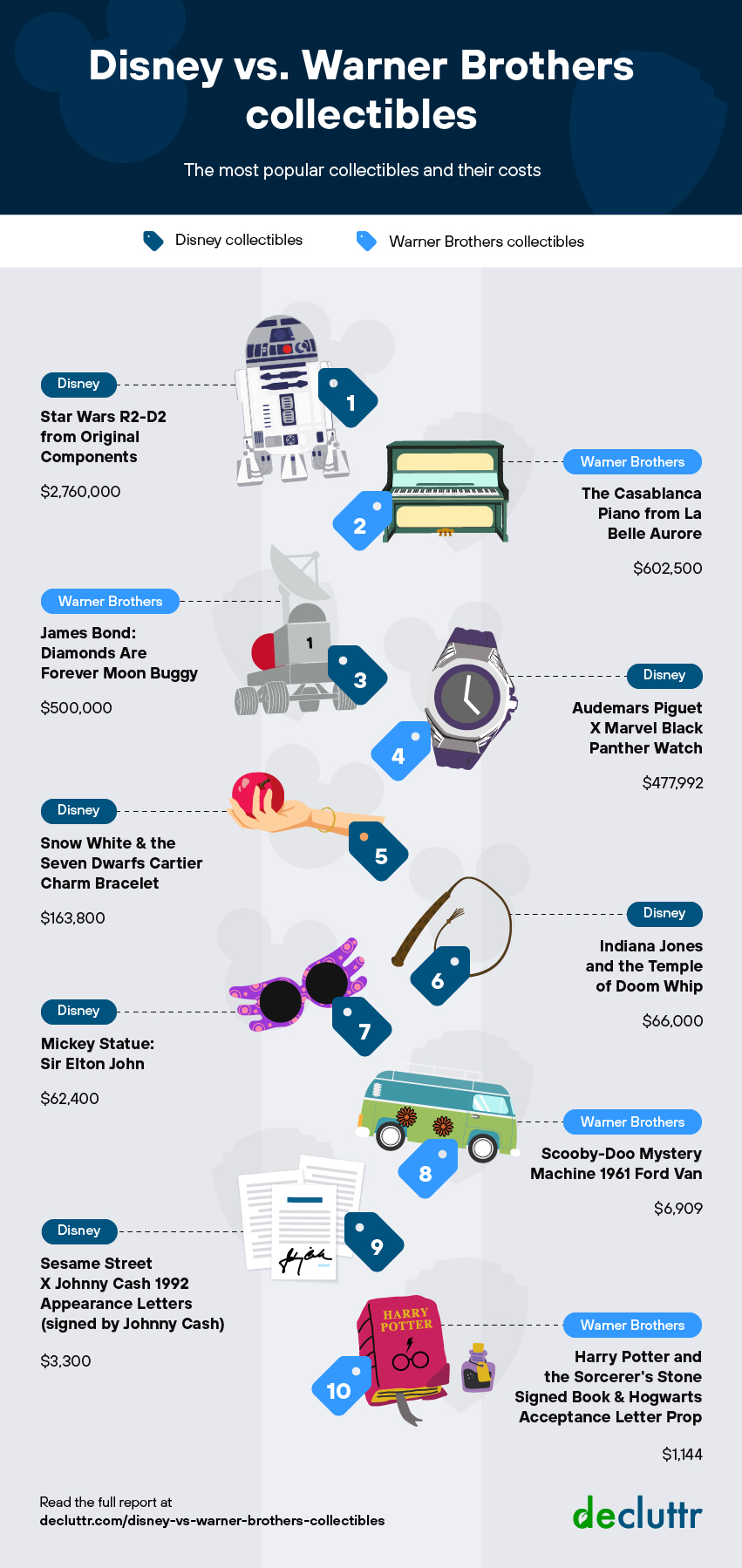 The study also includes a titanium limited edition Black Panther watch ($477,992), a Snow White gold and enamel charm bracelet ($163,800), a bull-whip from the 1984 film Indiana Jones ($66,000), an Elton John Mickey Mouse statue ($62,400), and more.
