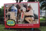 Topps has been a licensee of Star Wars since the very beginning in 1977 when the first trading cards were released to coincide with the release of the film. Those original Topps trading cards featured the iconic blue starfield design that has since become synonymous with Star Wars. Disney and Topps have created billboard-sized trading cards in the vintage Topps design to act as signage throughout the park during Star Wars Weekends.
