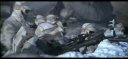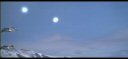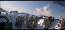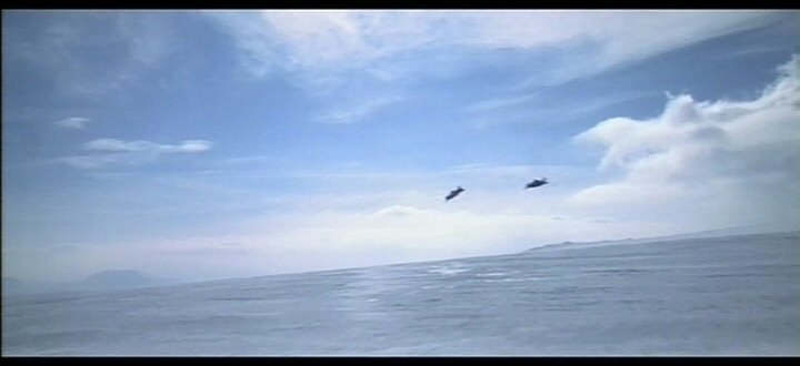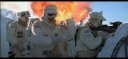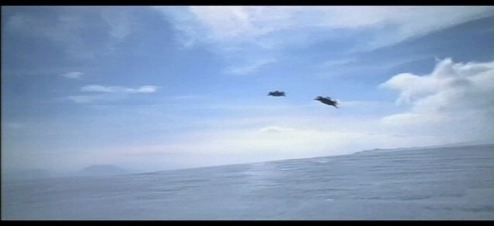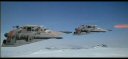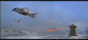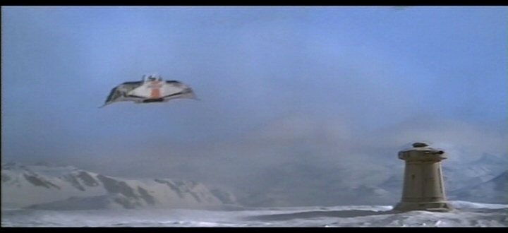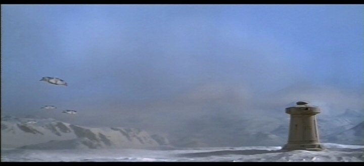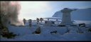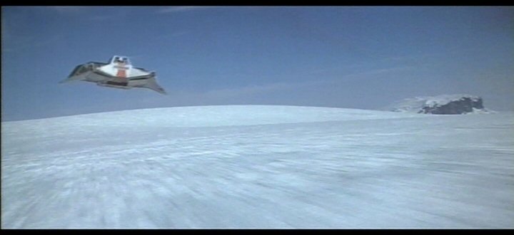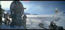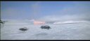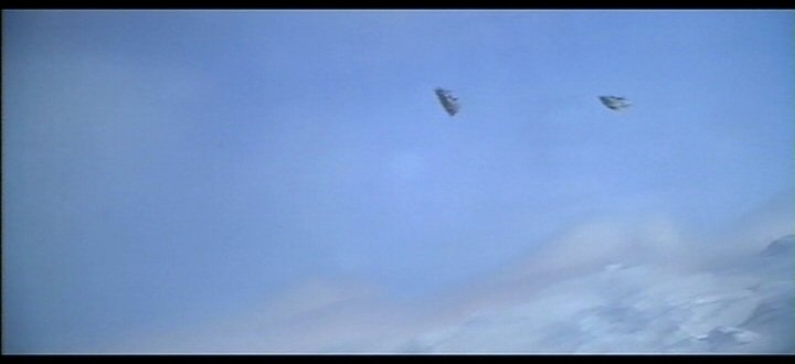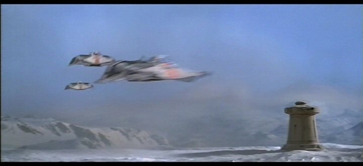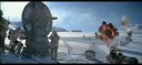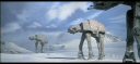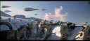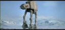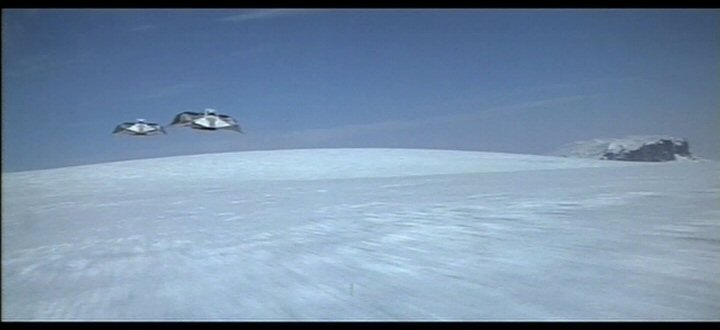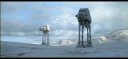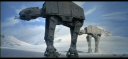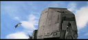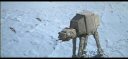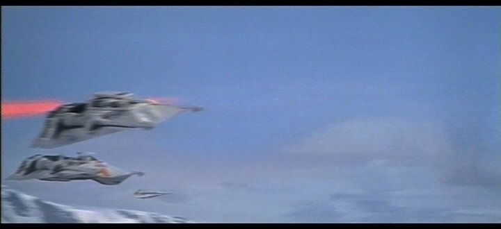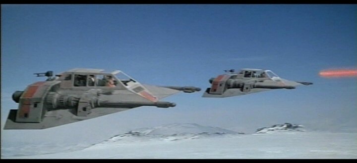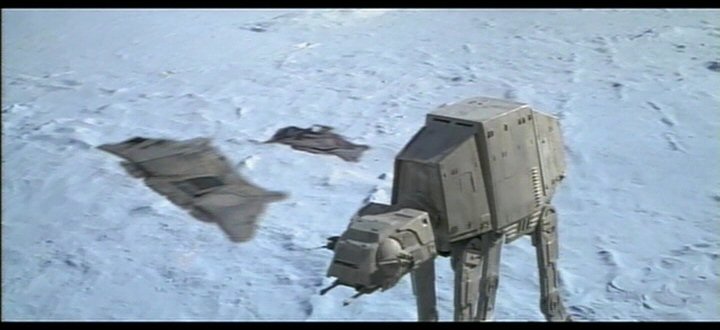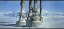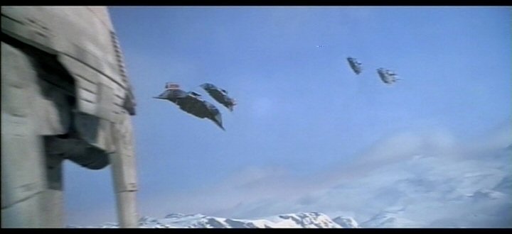 Four snowspeeders have flown past an AT-AT towards northern mountains.