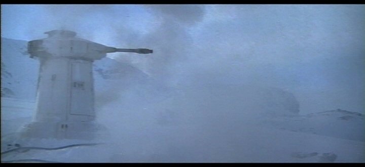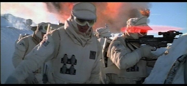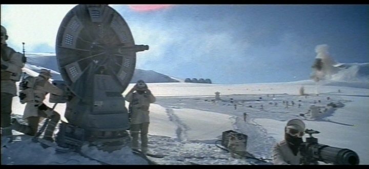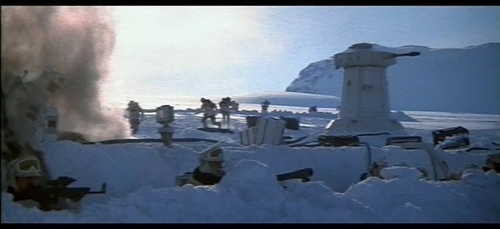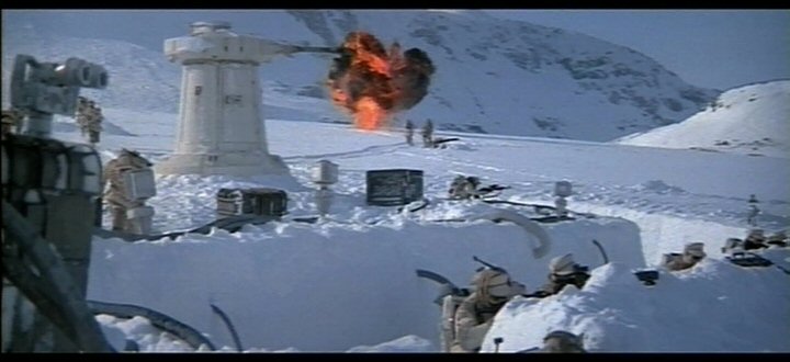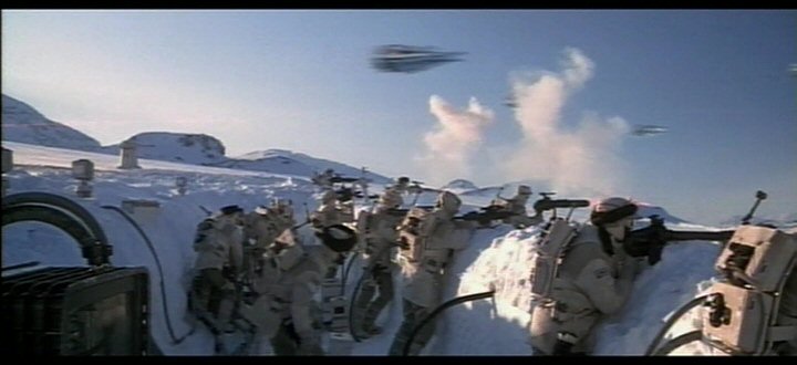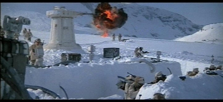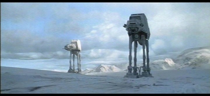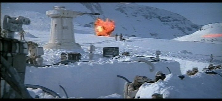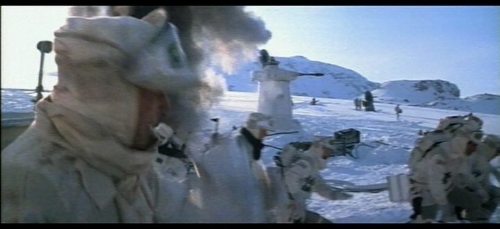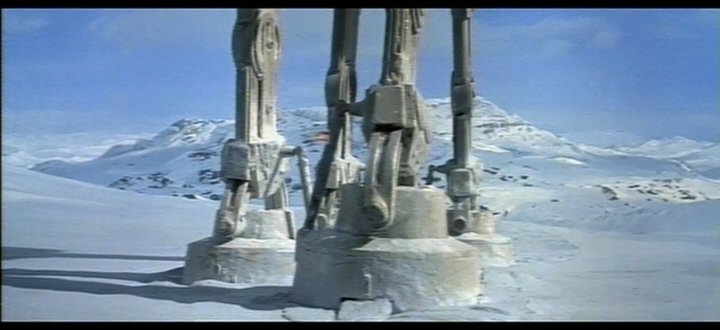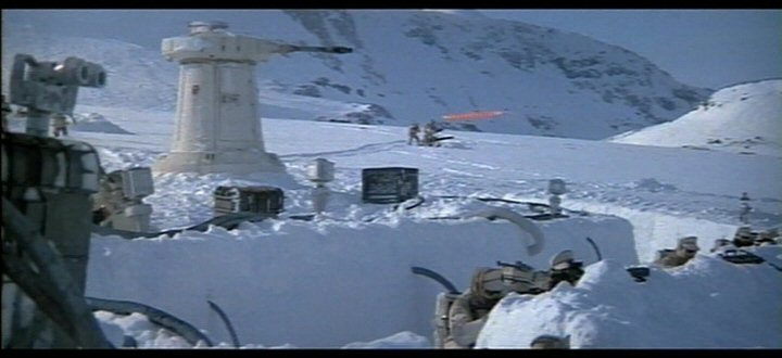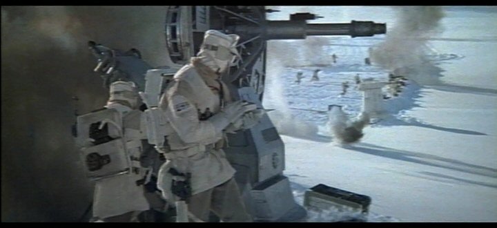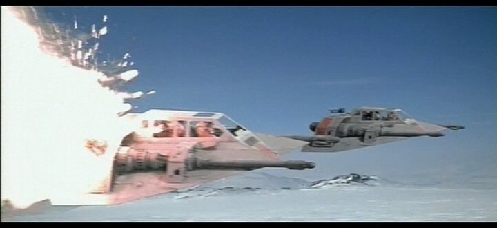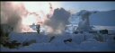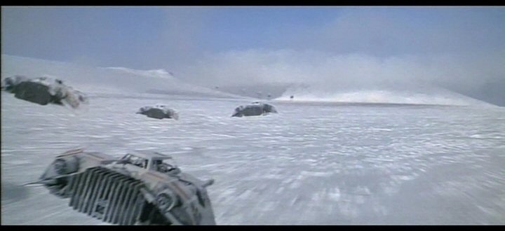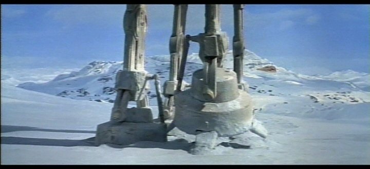 A smoking snowspeeder descends in the far background at the left of the picture.