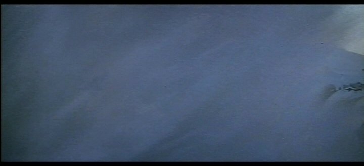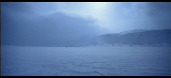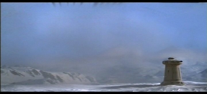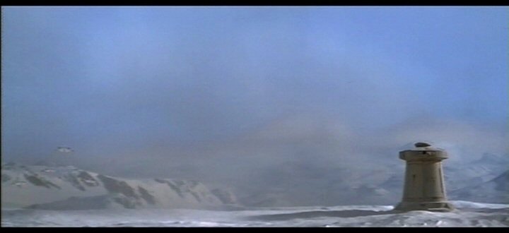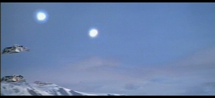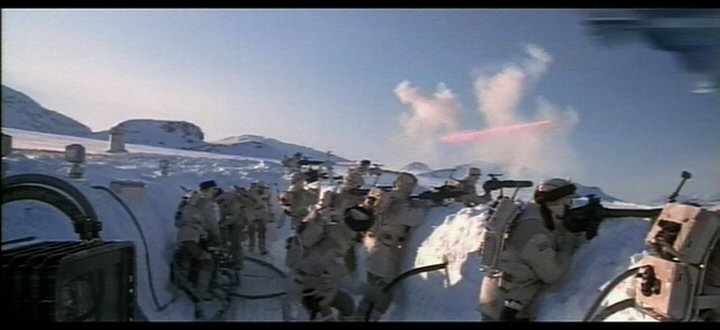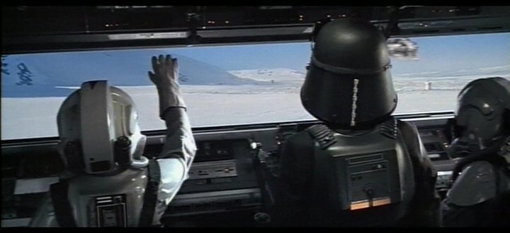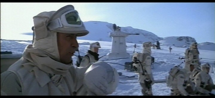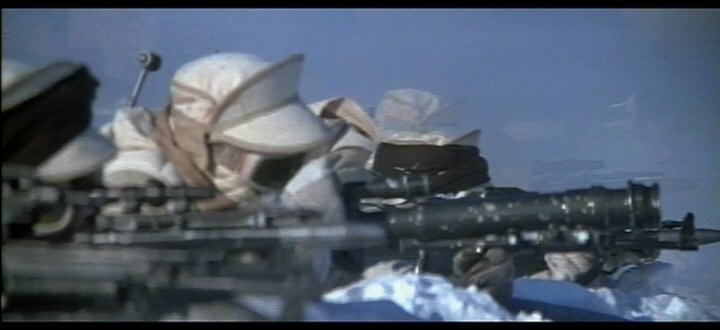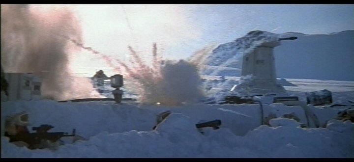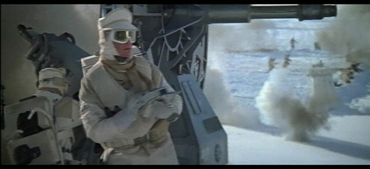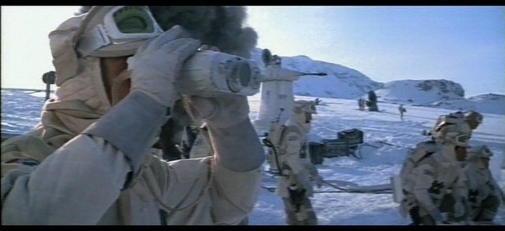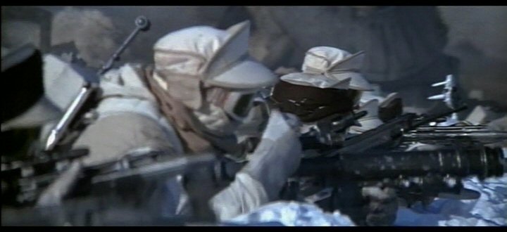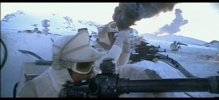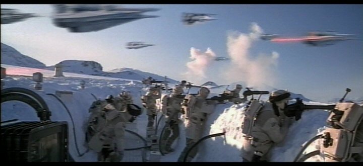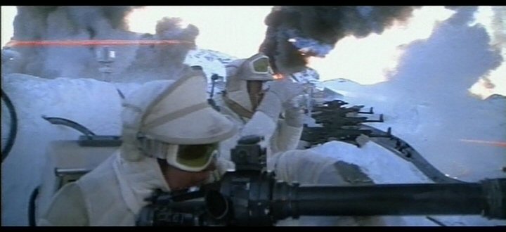 A smoking snowspeeder descends in the far background at the left of the picture.