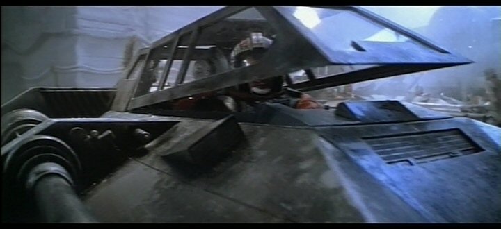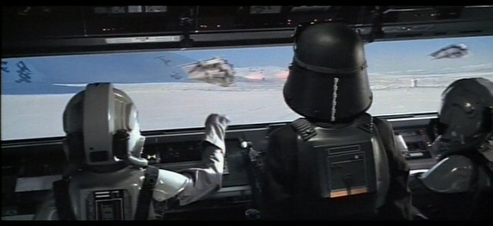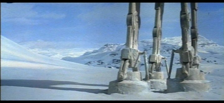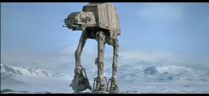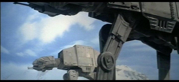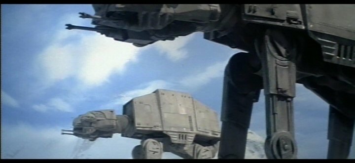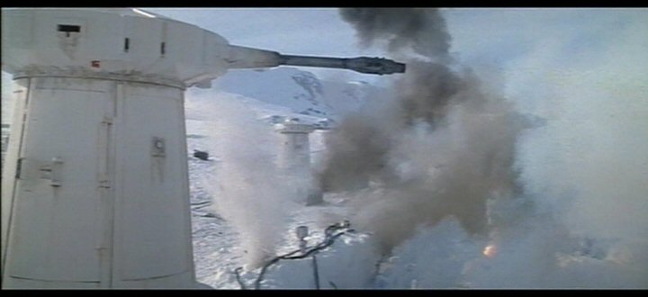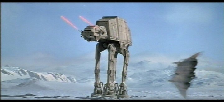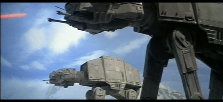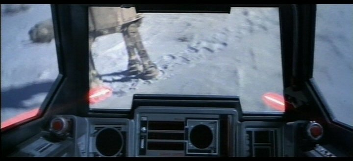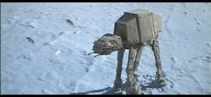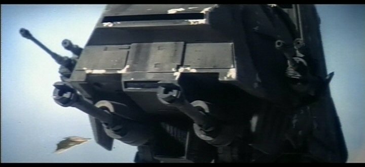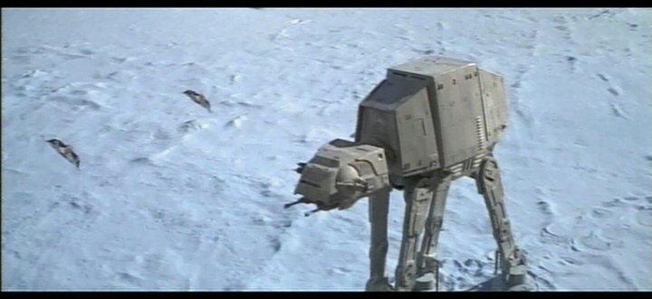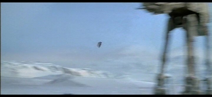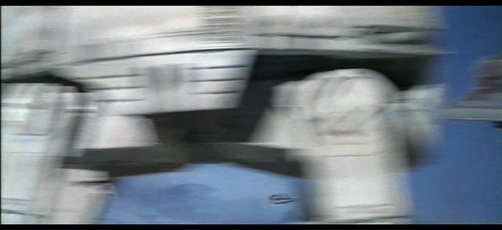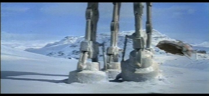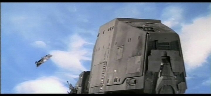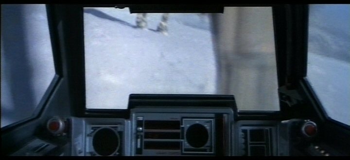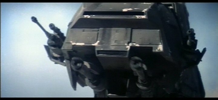 During the distraction another snowspeeder, Rogue Leader, passes between the walker's legs.