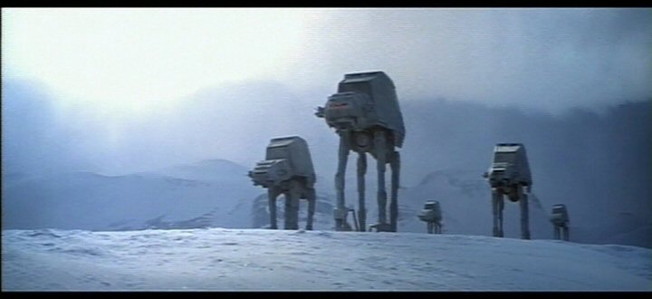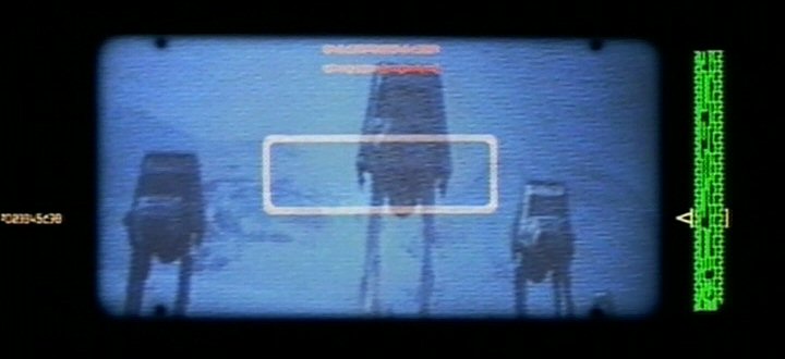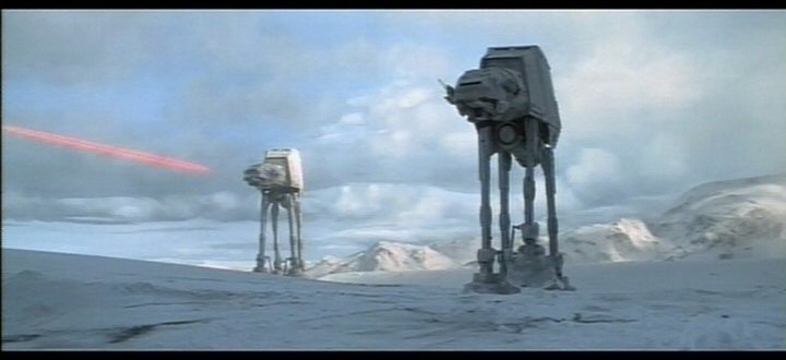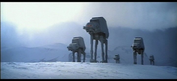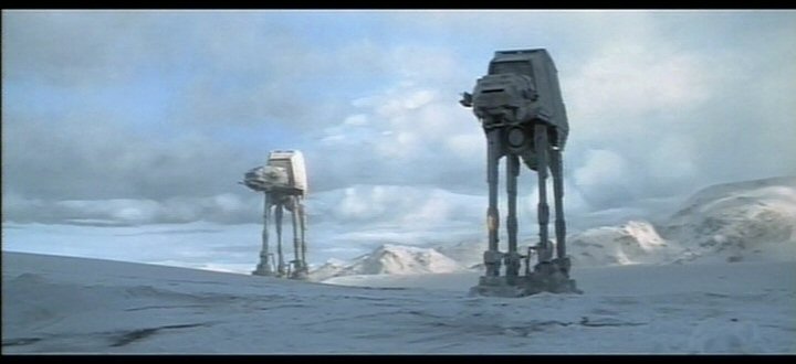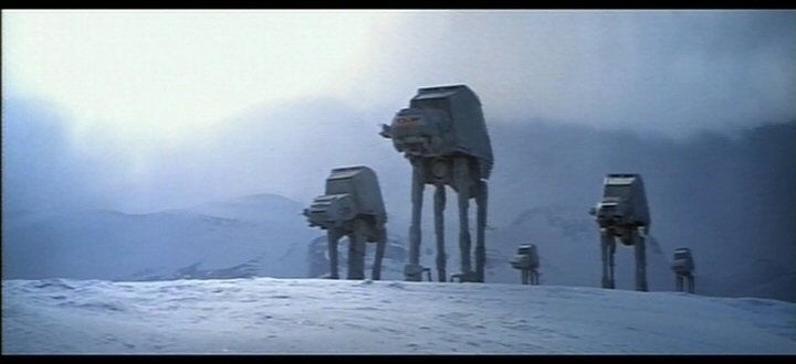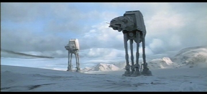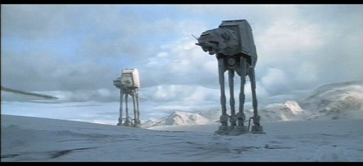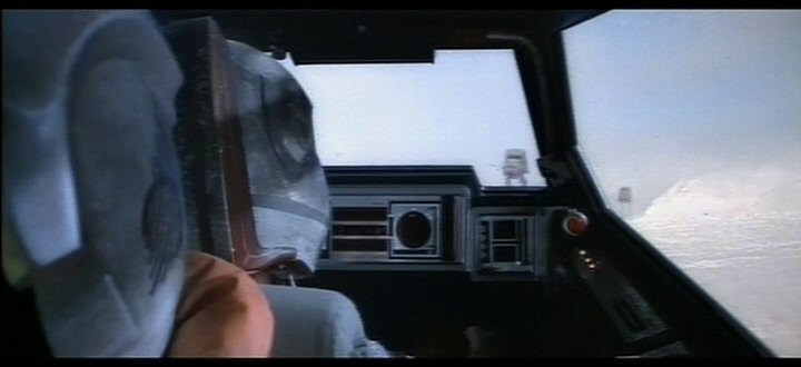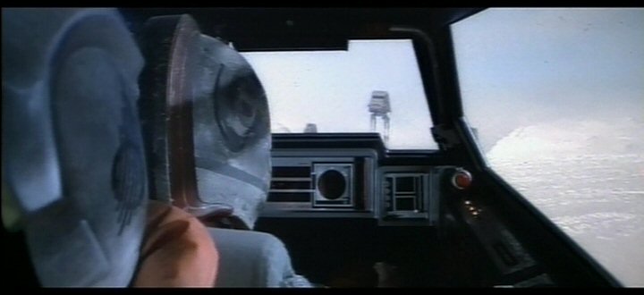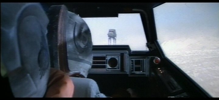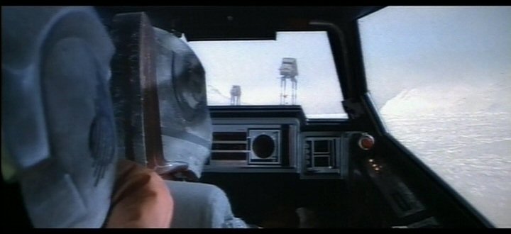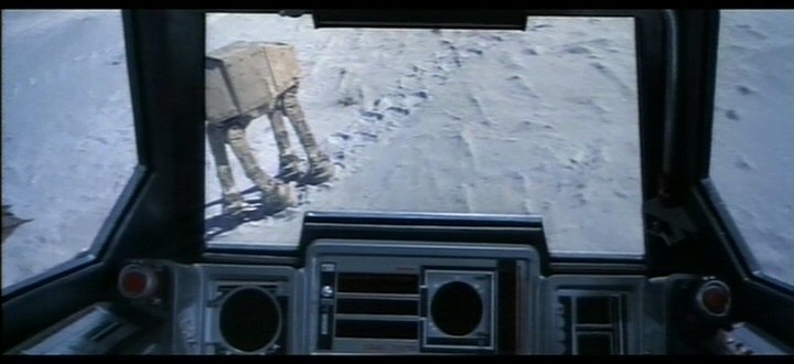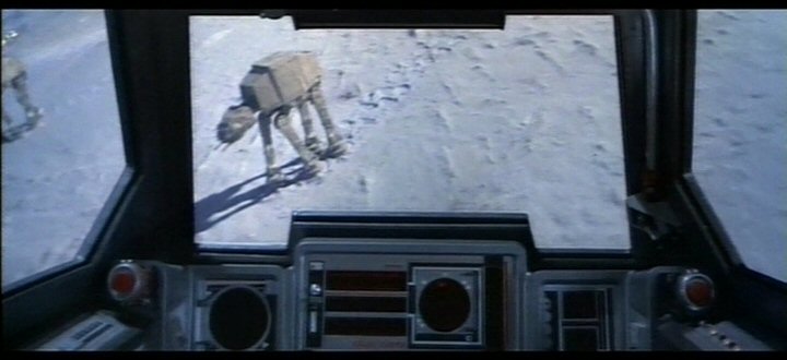 From the cockpit of a snowspeeder as it swoops towards a group of AT-AT walkers.