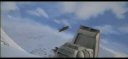 Rogue Leader dives towards the ground in front of an AT-AT walker. The walker is among snowy foothills, apparently heading south. |