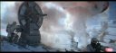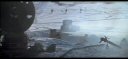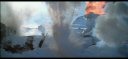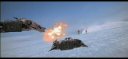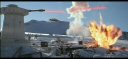 Explosions at the eastern end of the rebel trench system, where rebel guns face somewhat westerly towards the advancing and passing AT-ATs. The background mountain range contains the rebel base. A snowspeeder passes overhead, moving westwards towards the Imperials. |